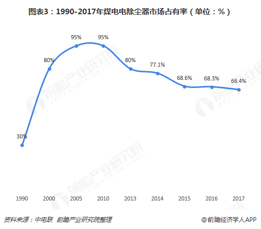 以燃煤电厂为例,近年来电除尘的技术创新,在煤电行业超低排放工作中取得了显著的成绩,有效地保障了机组长期稳定运行、持续超低排放运行。燃煤电厂电除尘器应用比例从1990年的30%发展到2000年的80%,2005-2010年间占比维持在95%,随后袋式、电袋复合除尘技术兴起,占比有所下降。据中电联统计,截至2017年12月,电除尘在电力行业除尘市场占有率约为66.4%,电除尘器依然是燃煤电厂的主流除尘设备,低低温电除尘技术几乎成为*内燃煤电厂超低排放的“标配”。