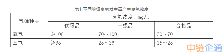2)不同等级的臭氧发生器产生臭氧的浓度见表1