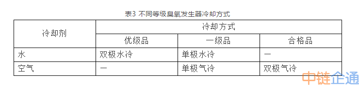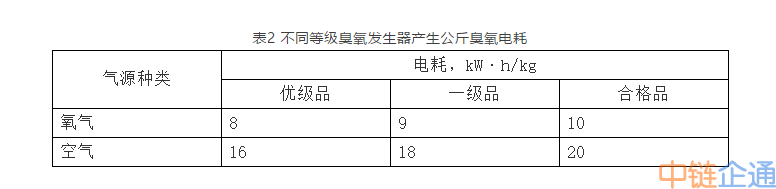 3)不同等级的臭氧发生器产生公斤臭氧的电耗见表2