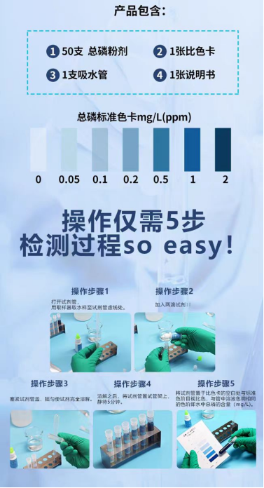 总磷超标防治一直是国家关注的重点,对于磷污染来说,做好废水总磷检测及处理,常见的快速检测工具有涛克总磷快速检测包,基于磷钼蓝比色法原理。操作简便快捷,测试成本低,可满足各种水质批量、快速、准确测定的要求。目前涛克氨氮快速检测包检测范围分0-2mg/L、0-5mg/L、0-10mg/L、0-50mg/L、0-100mg/L五个量程范围。