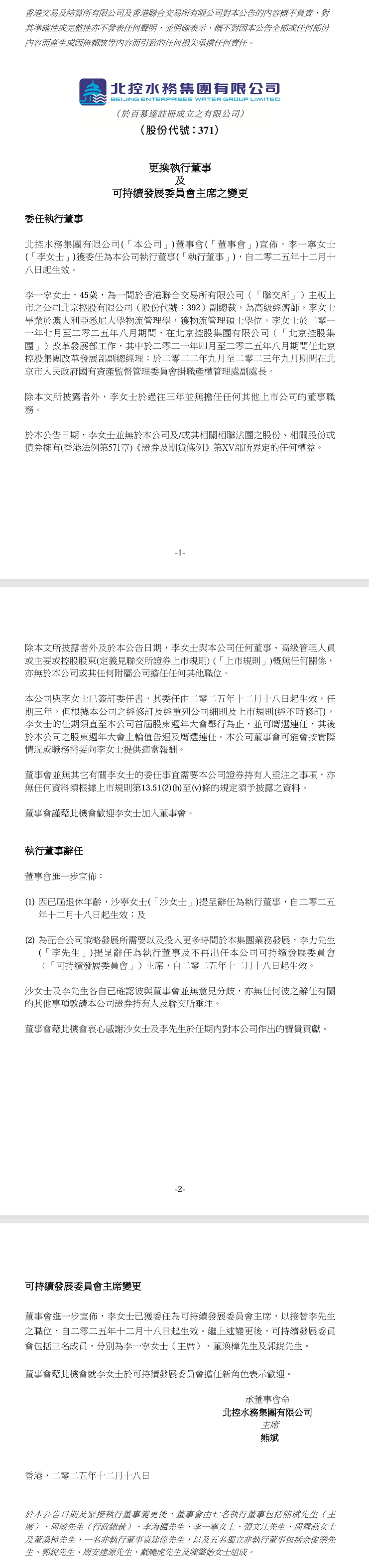 北控水务集团有限公司(简称:北控水务集团)近日公告称,自2025年12月18日起,委任李一宁女士为公司执行董事