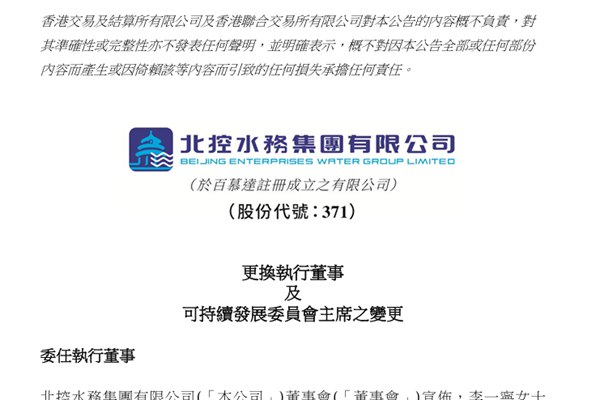 当前位置:中链企通环保网 > 新闻资讯 > 北控水务集团委任李一宁为执行董事