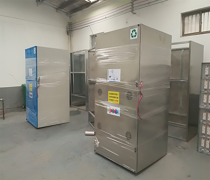 汽修厂喷漆房废气处理一体机采用的配置:初效过滤1道,中效过滤1道,活性炭过滤1道+蜂窝状活性炭吸附+uv紫外线灯管30套+7.5kw离心风机,壳体材质有:1.4mm镀锌板喷塑、201不锈钢、30