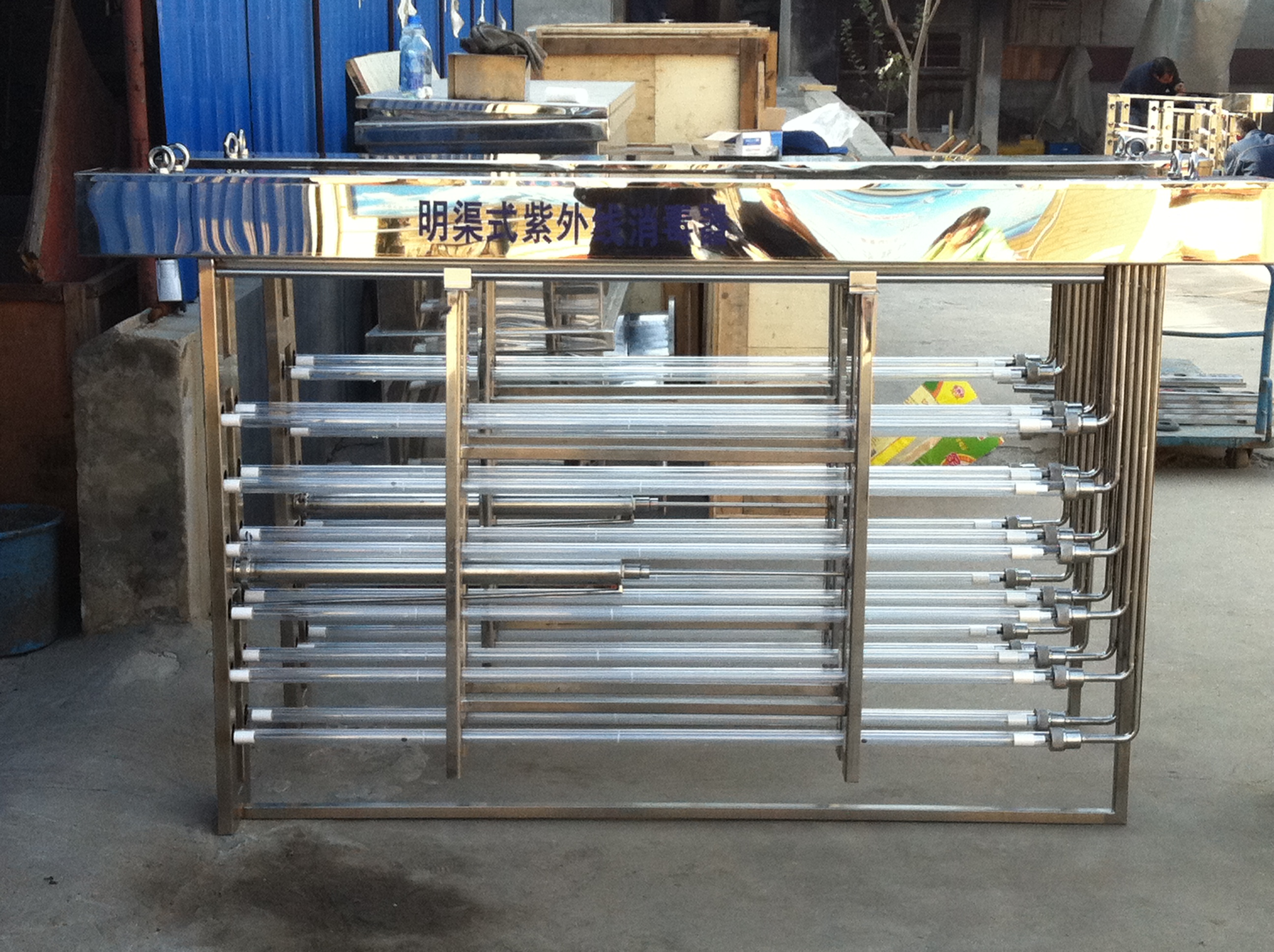 该设计优点:模块所用材质均为耐腐蚀的316L304不锈钢,整个系统中灯管插座、供电插座及紫外灯电线均封闭在紫外灯模块组件内,不会暴露于污水和紫外光水中。整个模块支架为316304不锈钢制造并安装在明渠的污水上方,每个模块单独设置,并无需紧固地悬挂在明渠内污水的上方,因此在更换灯管或石英套管时,每个模块能单独被吊起且不影响其他模块。
