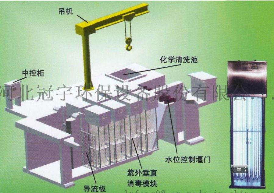 该设计优点:模块所用材质均为耐腐蚀的316L、304不锈钢,整个系统中灯管插座、供电插座及紫外灯电线均封闭在紫外灯模块组件内,不会暴露于污水和紫外光水中。整个模块支架为316、304不锈钢制造并安装在明渠的污水上方,每个模块单独设置,并无需紧固地悬挂在明渠内污水的上方,因此在更换灯管或石英套管时,每个模块能单独被吊起且不影响其他模块。