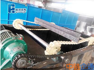 刮渣机由于工作在装满污水的气浮池上,位置特殊,工作环境恶劣,故要求设备结构简单,运行可靠,操作维修方便。常用的刮渣机有链条式刮渣机与行车式刮渣机。