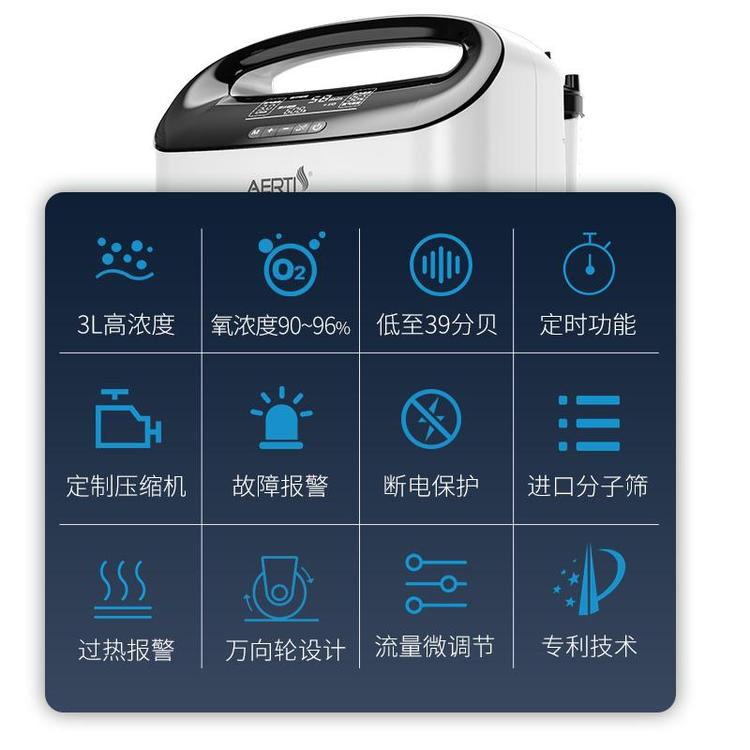 小巧、静音、高氧浓度,负离子功能,计时功能,带遥控,断电报警,温度报警,氧浓度报警,雾化