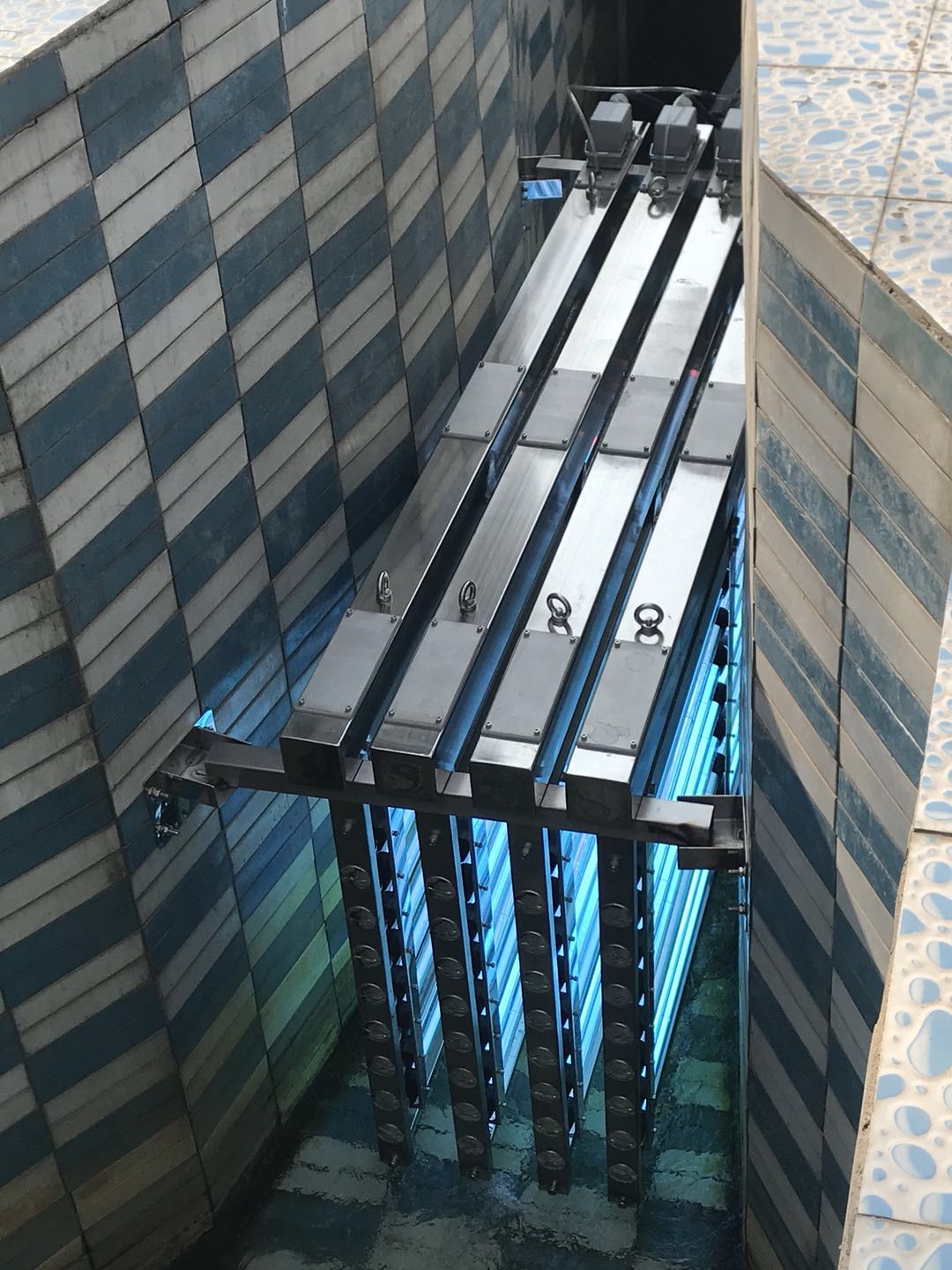冠宇紫外线消毒模块采用模块化设计,每个紫外线消毒模块由一个不锈钢灯架,若干紫外灯管,高透射率石英套管,自动清洗系统,模块支架,配电系统以及数据采集组成,电子镇流器单独封装置于镇流器柜中。整个紫外线消毒系统由若干紫外线消毒米快组成,每个模块单独设置,并无需拴紧地悬挂在明渠内污水的上方,因此在更换灯管或石英套管是,每个木块能单独被吊起且不影响其他模块便于安装,运行及维护。