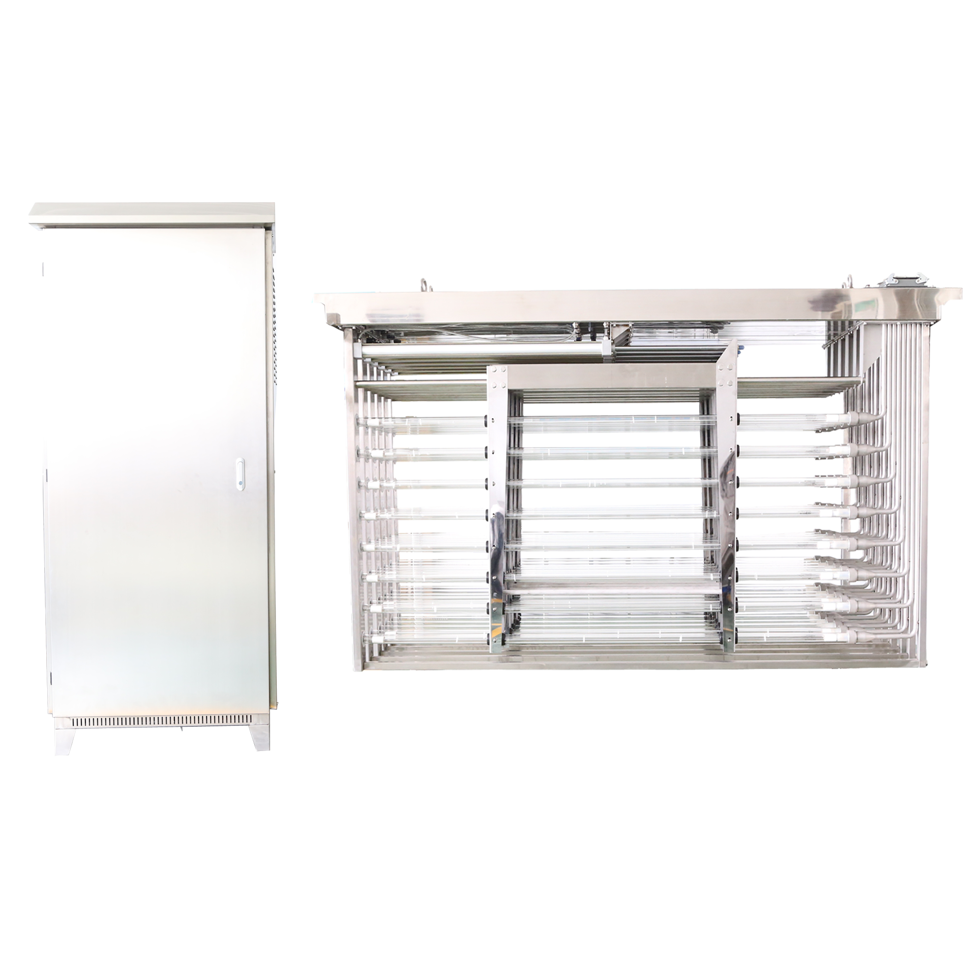 镇流器、工作指示灯、工作累时计、报警系统均置于外置的控制箱内;采用高纯石英套管配合高性能的紫外线低压汞齐消毒灯,具有杀菌力强,寿命长,运行稳定可靠,其杀菌效率≥99%,灯管使用寿命≥9000小时,此机型深受广大水处理工程公司欢迎,客户可根据需要处理的水质及水流量订制!