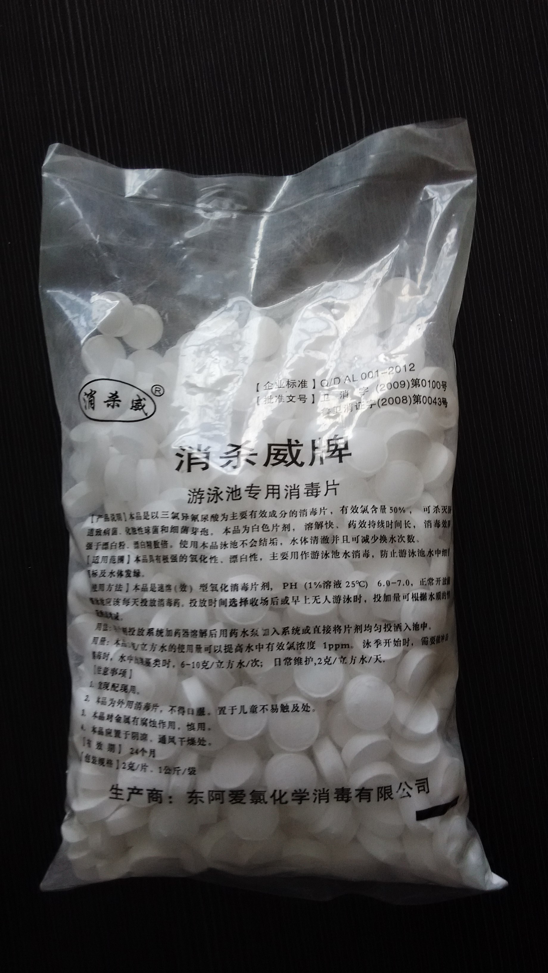 本品是一种新型、高效的杀菌消毒漂白剂。具有有效氯含量高、杀菌漂白效率高、贮运稳定、使用方便、安全无害等特点。杀菌消毒除藻片已在下述领域得到广泛应用:
