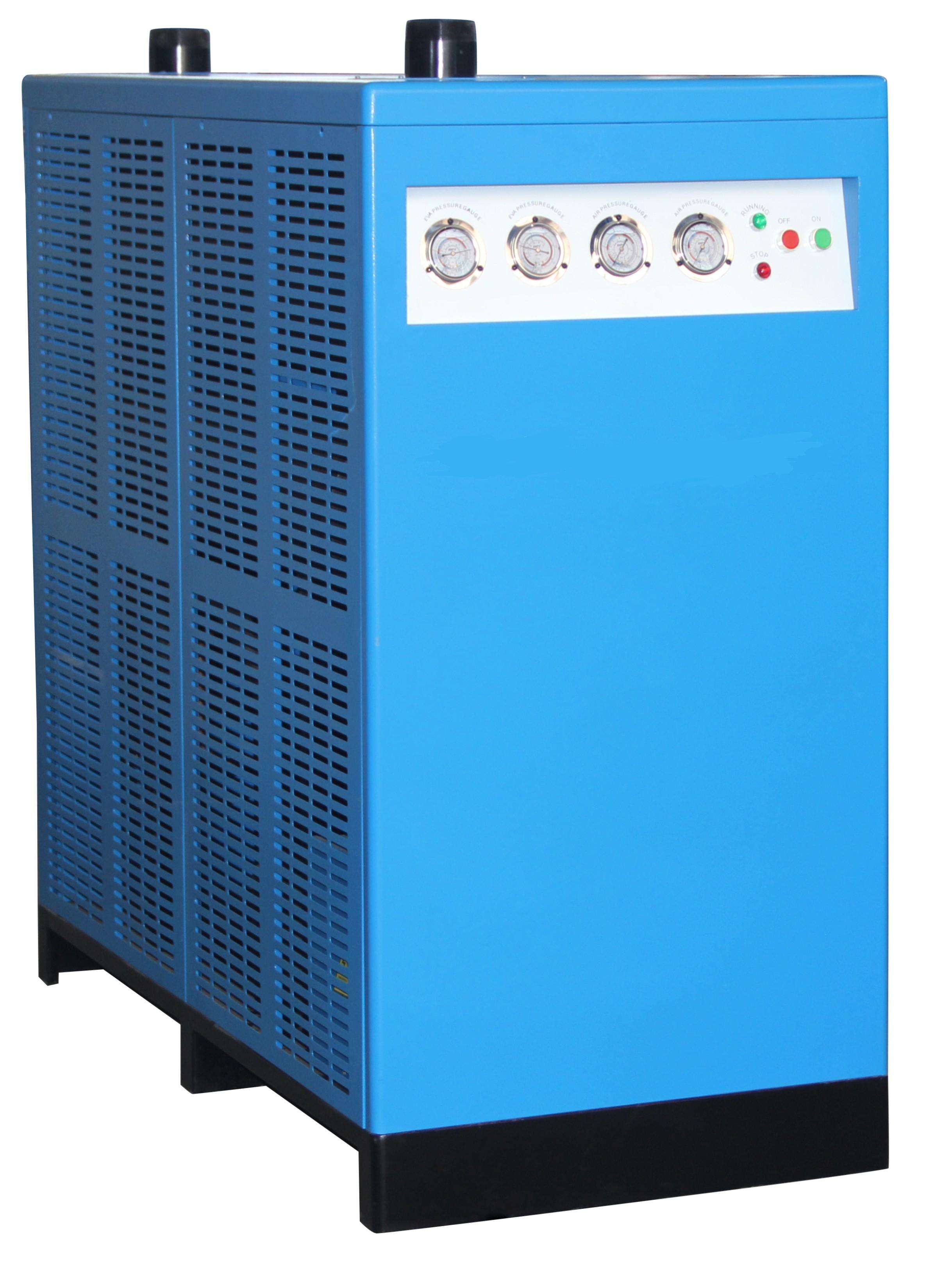 工作原理:冷干机是根据冷冻除湿原理,将压缩空气强制通过蒸发器进行热交换而降温,使压综空气中气态的水和油经过等压冷却,凝结成液态的 水和油,并夹带尘埃,通过自动排水器排出系统外,从而获得清洁的压缩空气。