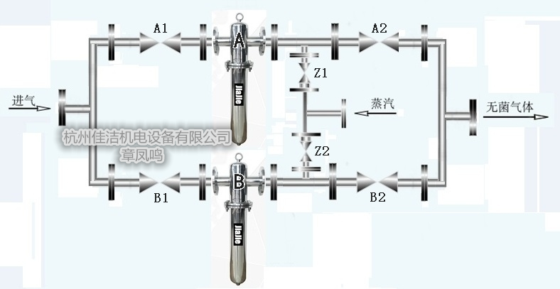 一备一用使用方法A过滤器使用①.打开A1 A2阀门,②.关闭B1 B2 Z1 Z2阀门,使用3天后A过滤器需要蒸汽灭菌时切换至B过滤器使用①.打开B1 B2,②.关闭A1 A2,③.打开Z1(蒸汽阀门) ④20-30分钟后关闭Z1,同样方式切换AB过滤器 交替使用,如有大疫情真空泵超负荷运行可以同时使用A B二台过滤器①.打开A1 A2 B1 B2阀门,②.关闭Z1 Z2阀门联系人;章凤鸣 微信13777578106