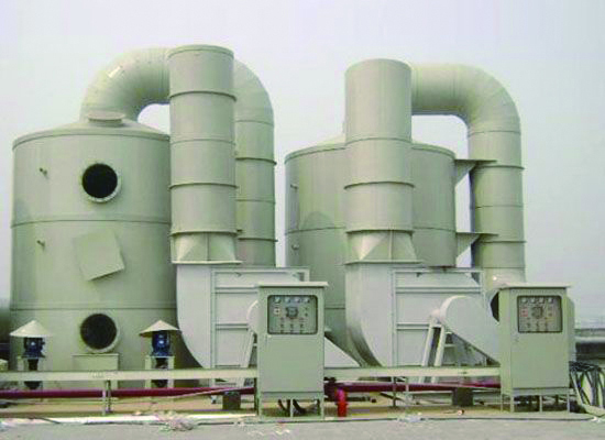 喷淋塔是一种新型的废气处理设备,含酸性成分气体从喷淋塔下方进气口沿切向进入喷淋塔塔,在通风机的动力作用下,迅速充满进气段空间,然后均匀地通过均流段上升到 级填料吸收段。在填料的表面上,气相中酸性物质与液相中碱性物质发生化学反应。反应生成可溶性盐类随吸收液流入下部贮液槽。未完全吸收的酸性气体继续上升进入 级喷淋段,在环保喷淋塔中吸收液从均布的喷嘴高速喷出,形成无数细小雾滴与气体充分混合、接触、继续发生化学反应。然后酸性气体上升到第二级填料段、喷淋段进行与 级类似的吸收过程。第二级与 级喷嘴密度不同,喷液压力不同,吸收酸性气体浓度范围也有所不同。在喷淋段及填料段两相接触的过程也是传热与传质的过程。通过控制空塔流速与滞贮时间保证这一过程的充分与稳定。对于某些化学活泼性较差的酸性气体,尚需在吸收液中加入一定量的表面活性剂。