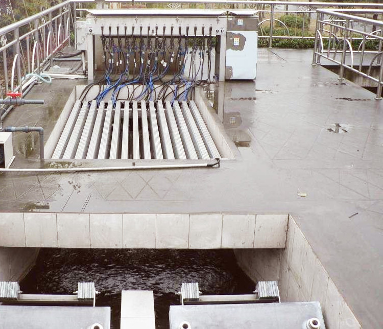 框架式(明渠式)紫外线杀菌器器是通过布置于开槽沟渠内的紫外消毒模块上的紫外灯发出中心辐射波长为253.7nm的短波紫外线对流经沟渠的水体进行杀菌消毒,从而解决处理后的污水细菌指标的超标问题,使终排放水体的细菌学标达到并超过国家相关排放标准及水质标准要求。