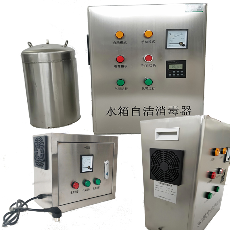 WTS水箱自洁消毒器通过高频高压电场,使氧转化为臭氧,并及时与水混合,利用臭氧的强氧化作用,杀灭水中的细菌。杀灭细菌效果较好的浓度,可以通过改变进压力、气量、电流等调节来达到。由于臭氧在水中的氧化还原电位为 2.07v,比氯(1.36v)高,所以在臭氧量仅为氯的万分之一时,灭菌效果比氯及其它药剂快600-3000 倍,数秒内可杀死细菌。
