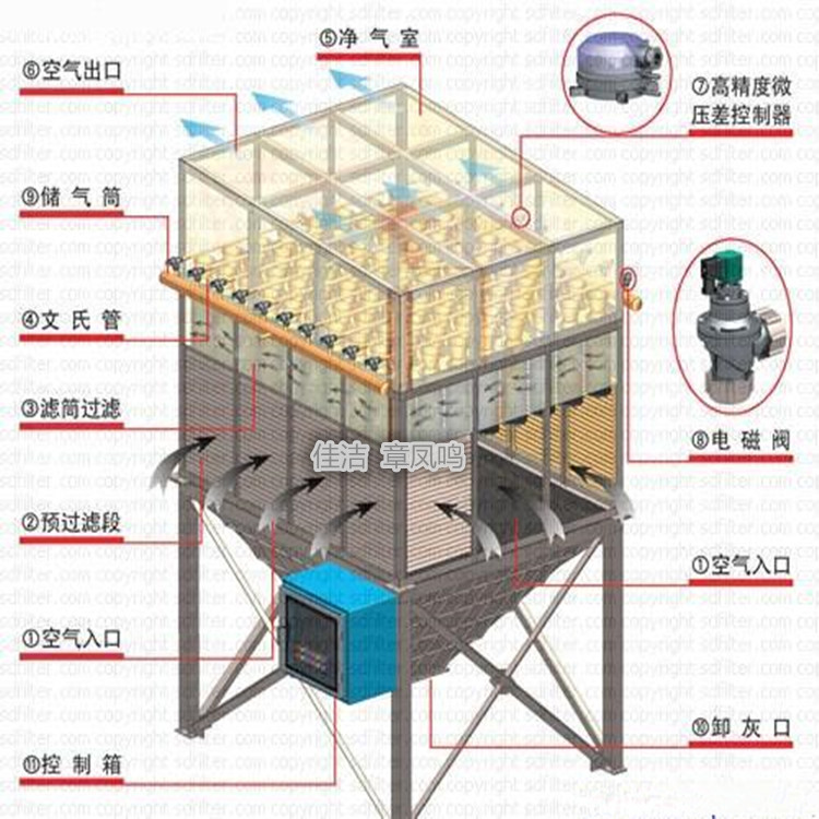 尘膜可使过滤效果有所提高,同时也使气流阻力z大。当阻力增至高限600Pa时,由压差变送器将阻力信号传给脉冲控制仪中的电脑,电脑发出指令,自洁系统开始工作;电磁阀接到指令后,按程序控制、驱动隔膜阀,隔膜阀瞬间释放出压缩空气,其压力为600~800kPa,经喷嘴整流后,自滤筒内部反吹滤筒,将滤料外表面的粉尘吹落,阻力随之下降。当阻力达到滤料的初始阻力(约150Pa)时,自洁系统停止工作。
