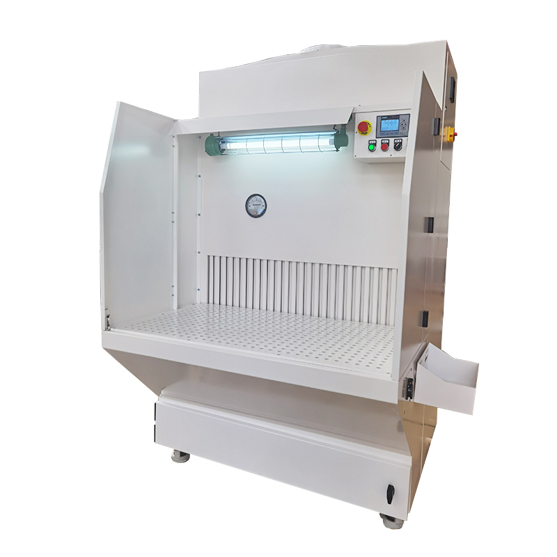济南美蓝环保生产的打磨除尘工作台采用三面包围式设计,对粉尘进行有效控制,工作台面为吸尘口,可在粉尘产生源头直接进行高效收集,及时阻止粉尘的扩散,粉尘通过精度高达0.3μm的高效阻燃滤芯过滤净化后,干净的空气直接排放在室内,保持车间空气清洁。被过滤后掉的粉尘收集在集尘抽屉内,防止二次污染,同时对贵重金属物料起到回收作用。