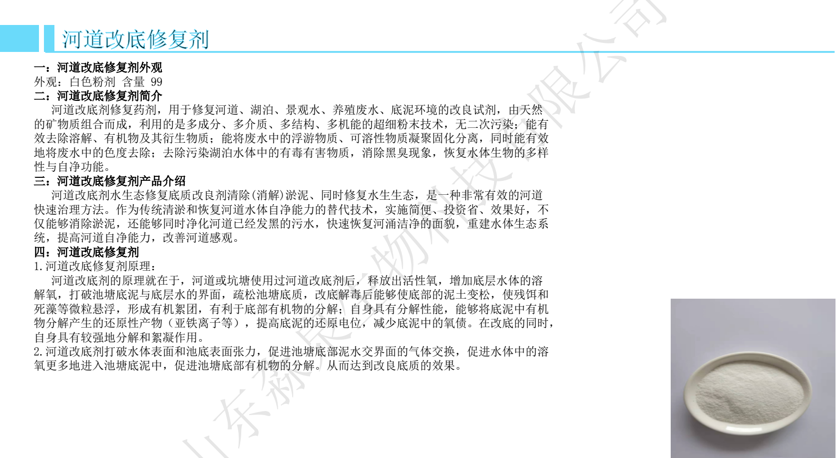 河道改底剂水生态修复底质改良剂清除(消解)淤泥、同时修复水生生态,是一种非常有效的河道 快速治理方法。作为传统清淤和恢复河道水体自净能力的替代技术,实施简便、投资省、效果好,不 仅能够消除淤泥,还能够同时净化河道已经发黑的污水,快速恢复河涌洁净的面貌,重建水体生态系 统,提高河道自净能力,改善河道感