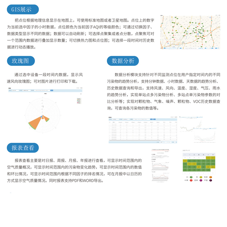 *选配数据服务平台可显示分钟、小时均值、日均值。报表分析功能,可生成日报表,月报表,年报表、趋势分析等功能。支持同屏多点位显示,支持移动终端数据查询,也可向显示终端推送数据;