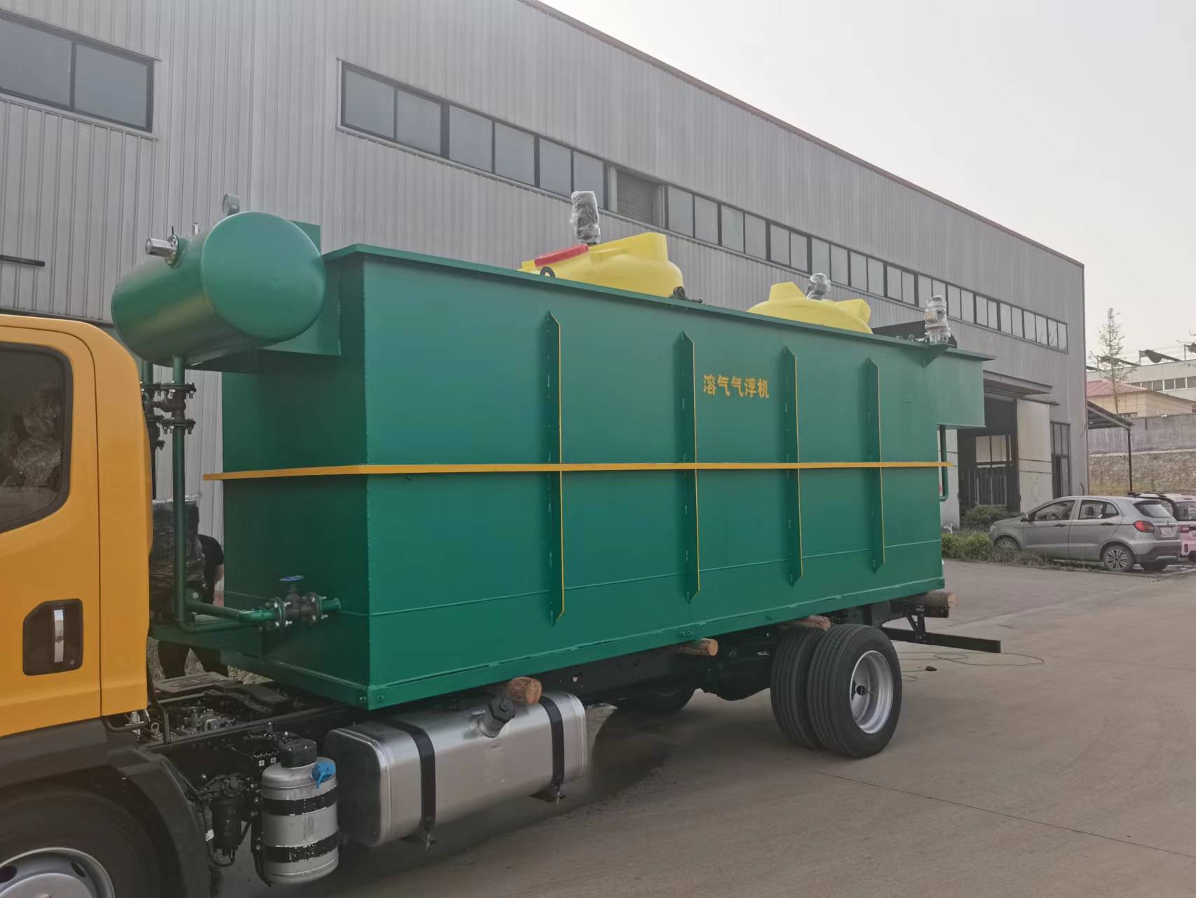 溶气气浮机是利用清水或部分处理后的回流水,经微气泡发生器将空气吸入混合,形成溶气水,在气浮池内减压释放,融入水中的空气以20-30um气泡形成析出,具有很高的表面积和吸附能力,对不同浓度污水的悬浮物均可较好的去除,处理后部分清水(设计指标为20%-40%,通常可采用30%),经气浮循环工作泵,加压进水溶气罐中与空气进行混合,空气溶解到水中,这时容器效率达到80%以上。溶解在水中的空气从水中释放出来,形成粒径为20-50um的微气泡,微气泡同污水中的悬浮物结合,使悬浮物在污水中的比重变小,直至浮上水体表面;形成大量浮渣,再由气浮池上安装的链式刮渣机,把浮渣清除,达到处理效果。