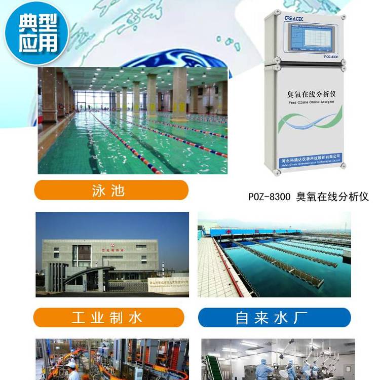 适用于泳池水臭氧消毒、制药行业生产用水的杀菌消毒、纯净水、矿泉水、各种饮料用水的杀菌消毒、自来水、生活饮用水及工业纯水杀菌消毒的测量和控制。