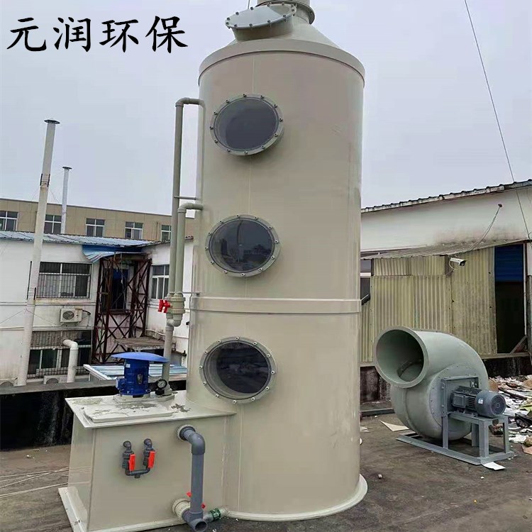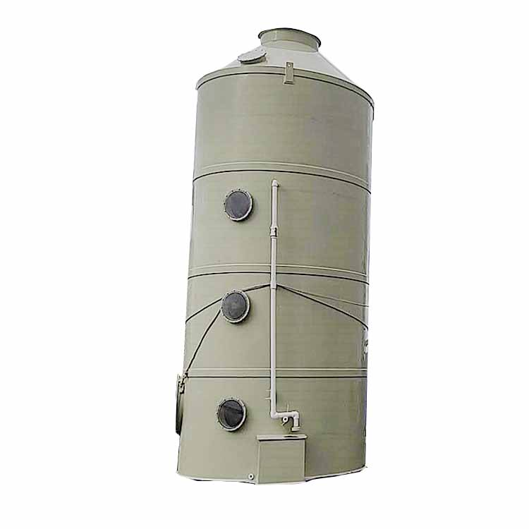 本公司生产的填料喷淋吸收塔采用的是气液逆向吸收方式处理。填料塔是以塔内的填料作为气液两相间接触构件的传质设备,塔身是一直立式圆筒,底部装有支承板,填料放置在支承板上,填料的上方安装填料压板,以防被上升气流吹动。液体自塔顶向下以雾状(或小滴)喷撒而下,废气则自塔底向上运行,以达到气液相接触的目的。气体污染物通过扩散等质量传送及化学作用等方式送入洗涤液体中,进而实现气体分离。