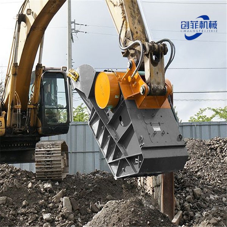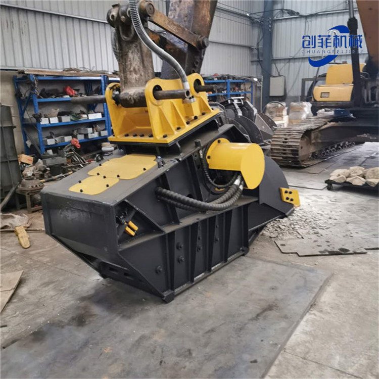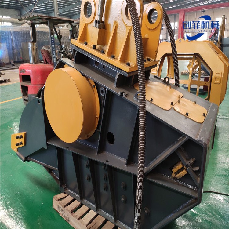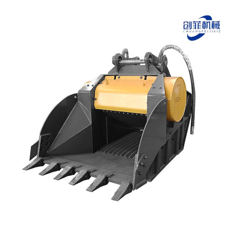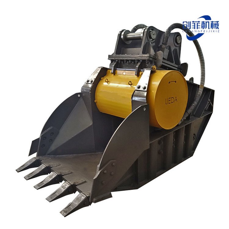 该系列挖掘机破碎斗的破碎方式为曲动挤压型,液压马达通过花键轴驱动偏心主轴,通过偏心轴使动颚上下运动,当动颚上升时,顶板和动颚间夹角变大,进料口的楔型空间变大,大块物料在重力作用下,向下运动,当动颚板向定锷板接近时,进料口的楔型空间变小,物料被挤压、搓、碾等多重破碎;与此同时当动颚下行时,顶板和动颚间夹角变小,挖掘机破碎斗,动颚板在拉杆、弹簧的作用下离开定颚板,此时已破碎物料从破碎腔下口排出,随着液压马达的连续转动,石子挖掘机破碎斗,破碎斗动颚作周期性的压碎和排料