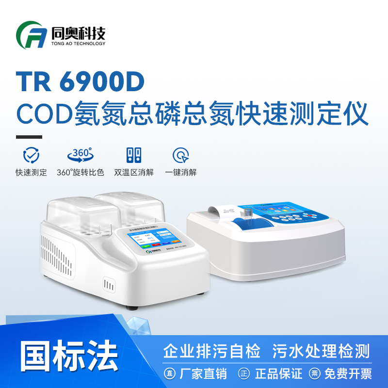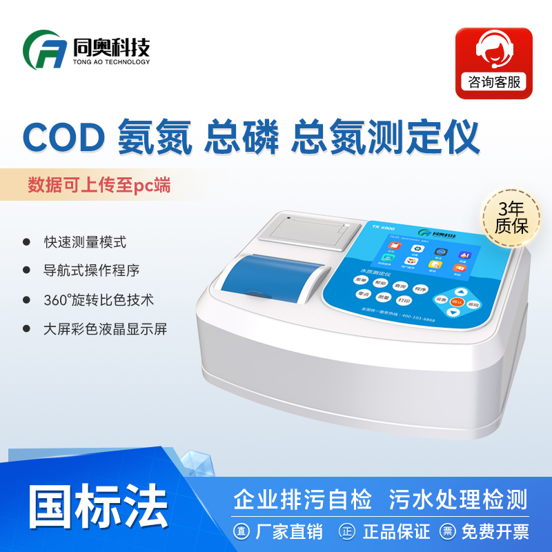 同奥科技 COD检测仪总磷总氮分析仪TR-6900D该仪器可快速测定水中的cod、氨氮、总磷、总氮、浊度、悬浮物参数。仪器显示界面采用大屏液晶屏显示,按键操作,数据直读,操作简单省时,界面设计简单大方,固定式多通道光路设计模式,可自动切换光源通道,使光源更加稳定,消除了传统手工转动的误差因素;仪器检测范围广,可拓展数十种检测参数,根据需求定制,达到资源利用优化,智能操作程序,可选择标准测量或连续测量模式,在快速性和准确性间自由选择,引导用户轻松完成操作。同奥科技 COD检测仪总磷总氮分析仪TR-6900D广泛应用于应急监测、工业废水、生活污水、污水处理、医药化工、食品、饮品、纺织印染、电镀、造纸、石油冶金、河流治理、科研单位、院校等领域。