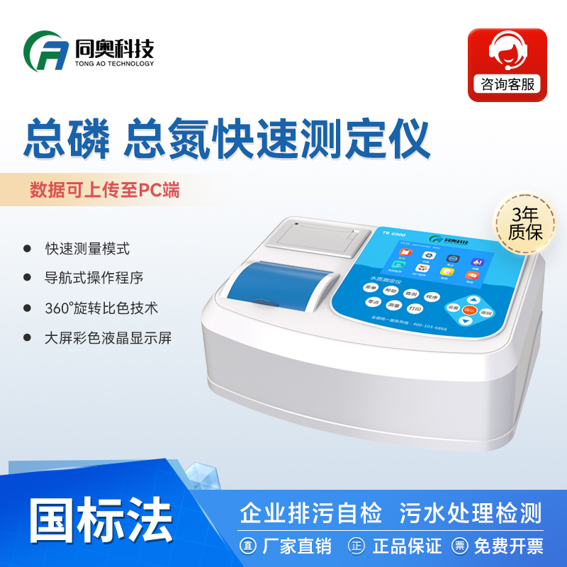 同奥科技 总磷检测仪总氮分析仪 TR-6900PN仪器可快速测定水中总磷、总氮、浊度、悬浮物参数,集成了同奥水质分析领域成熟技术,使整个分析系统更加完善,操作更加简单、快速,检测结果更加稳定可靠。仪器显示界面采用大屏液晶屏显示,按键操作,数据直读,操作简单省时;检测范围广,可拓展数十种检测参数,根据需求定制,达到资源利用优化,智能操作程序,可选择标准测量或连续测量模式,在快速性和准确性间自由选择,引导用户轻松完成操作。同奥科技 总磷检测仪总氮分析仪 TR-6900PN广泛应用于应急监测、工业废水、生活污水、污水处理、医药化工、食品、饮品、纺织印染、电镀、造纸、石油冶金、河流治理、科研单位、院校等领域。