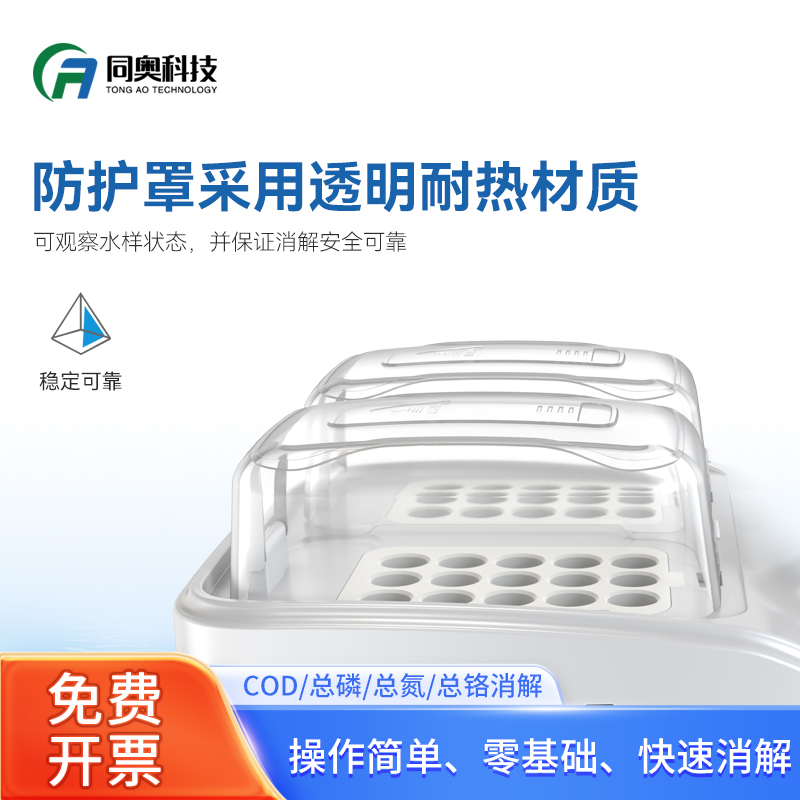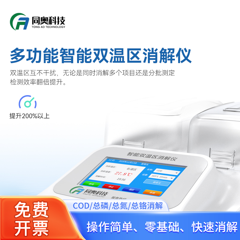 功能特点 1、 4.3 寸触摸显示屏,中文显示,实时显示当前温度和时间; 2、 内置 COD、总磷、总氮、总铬等标准消解模式; 3、 人性化操作界面,轻松选择消解模式,一键启动消解; 4、 双温区控制,独立操作、互不干扰,不同参数可同时消解。
