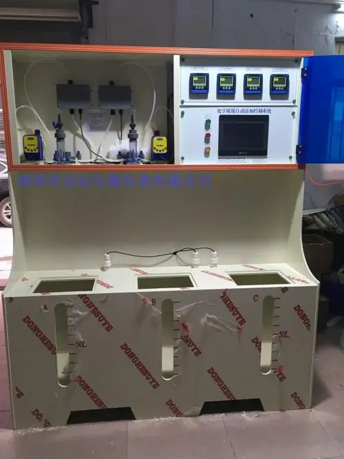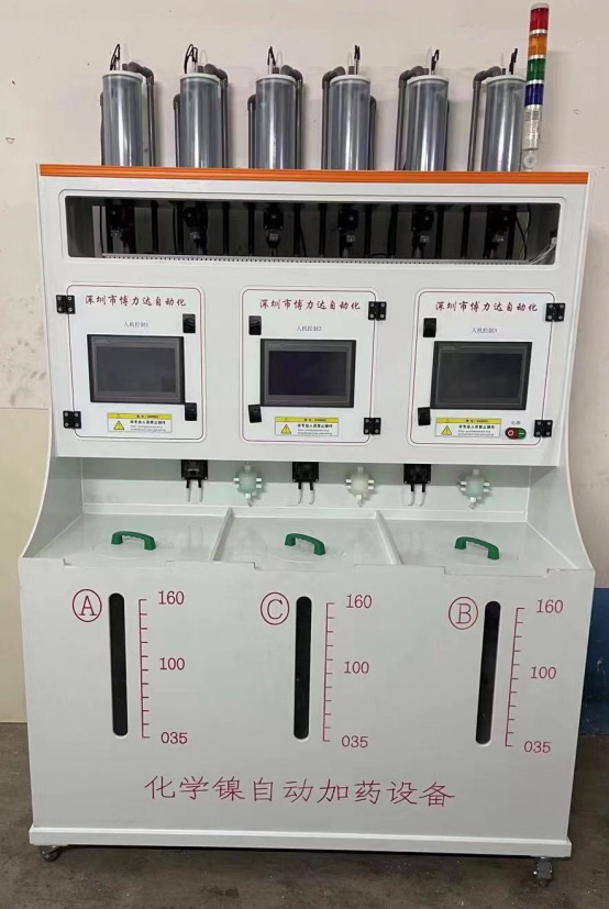 化学镀镍生产过程中,重要的4大要素是:A、镍离子浓度的控制;B、pH值的控制;C、温度的控制;D、化镀产品的时间把控。如果把这4大要素控制好在一个合适的范围内,那么制造出来的产品必然是产品。镍离子浓度和pH值的控制在一定的范围,是我们本套自动加药机的大功能,可以时刻在线监测,从而达到智能化的监测和加药作用。而温度的控制是简单的控制;时间把控是操作工人和药水决定的。