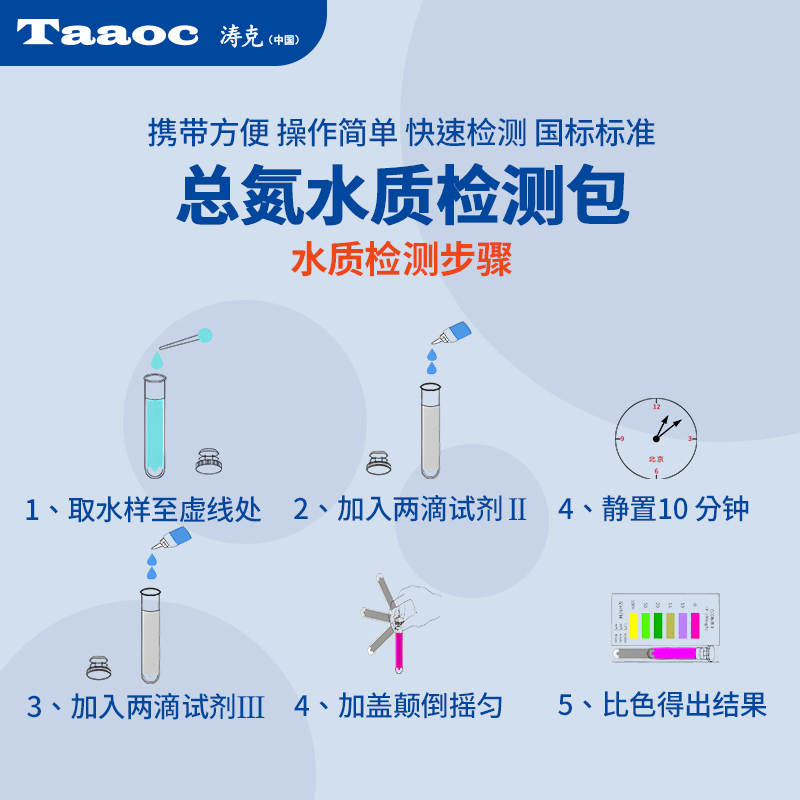 涛克 水质快速检测包总氮快速测试包总氮测试包0-100mg/l可快速测定水中的总氮含量,小巧、便捷,便于携带,无论您是在生产现场进行快速测定,还是在户外进行快速排查,测试包均能满足您的水质检测使用需求。测试包集成了水质分析领域成熟技术,整个操作流程简单、快速,检测结果稳定可靠。