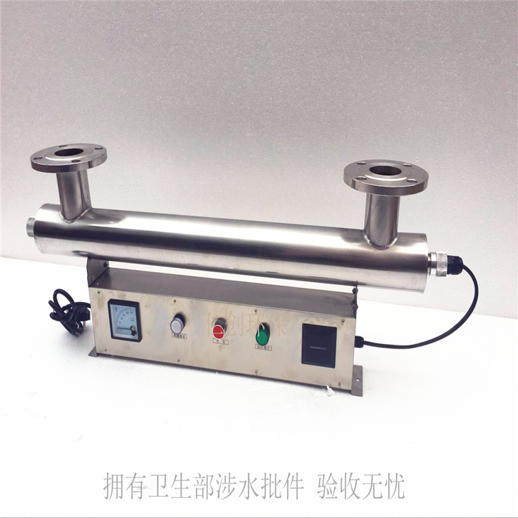 我公司生产的RC系列紫外线消毒器装置,采用 的高强度无臭紫外线杀菌灯,简体内壁经过特殊处理的食品级304不锈钢,使经过预处理的水流过筒体时受到波长253.7nm紫外线足够量的照射,具有良好的杀菌效果
