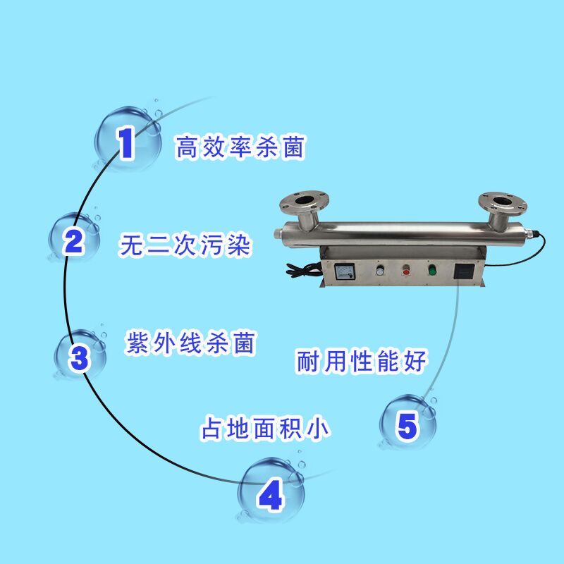 我公司生产的RC系列紫外线消毒器装置,采用 的高强度无臭紫外线杀菌灯,简体内壁经过特殊处理的食品级304不锈钢,使经过预处理的水流过筒体时受到波长253.7nm紫外线足够量的照射,具有良好的杀菌效果