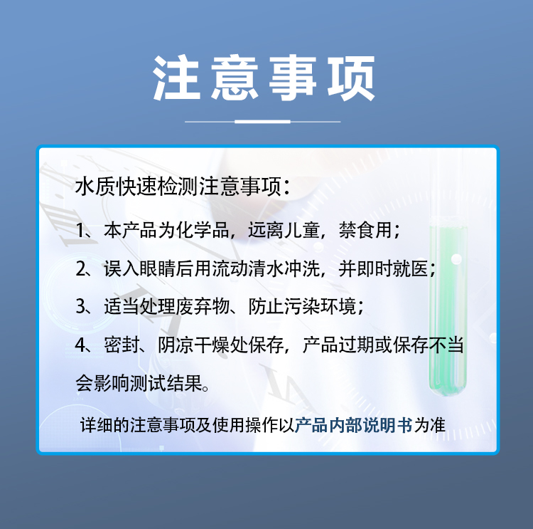 1、本产品使用少量化学药品,使用前请认真阅读说明书;