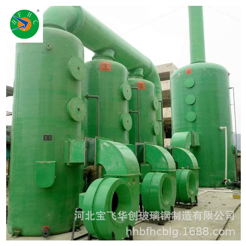 氨氮废气从塔体下方进气口进入净化塔,在通风机的动力作用下,迅速充满进气段空间,然后均匀地通过均流段上升到 级填料吸收段。在填料的表面上,气相中氨气与液相中水或硫酸发生化学反应,反应生成NH3-OH,(NH4)2SO4,并流入下部贮液槽。未完全吸收的氨气体继续上升进入 级喷淋段。在喷淋段中吸收液从均布的喷嘴高速喷出,形成无数细小雾滴,与气体充分混合接触,继续发生化学反应,然后氨气上升到二级填料段、喷淋段进行与 级类似的吸收过程。第二级与 级喷嘴密度不同,喷液压力不同,吸收酸性气体浓度范围也有所不同。在喷淋段及填料段两相接触的过程也是传热与传质的过程。通过控制塔流速与滞留时间保证这一过程的充分与稳定。塔体的最上部是除雾段,气体中所夹的吸收液雾滴在这里被清除下来,经过处理后的洁净空气从净化塔上端排气管排入大气。经过水或硫酸吸收的,可用于锅炉脱硫或作农肥。
