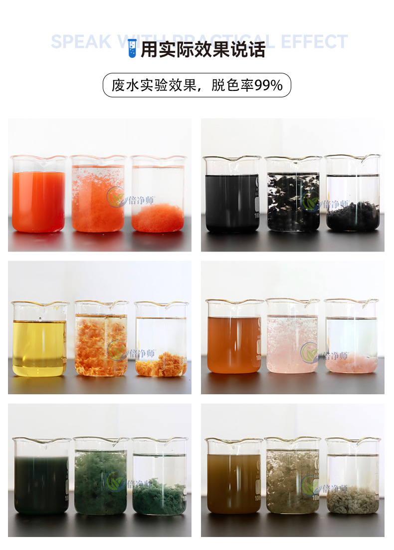 倍净师® 高效脱色絮凝剂是本公司自主研发生产,集脱色、絮凝、降 COD、BOD 等多种功能一体的有机高分子复配聚合物,属于絮凝脱色水处理剂,污水脱色絮凝剂应用范围广泛,不影响生化系统。