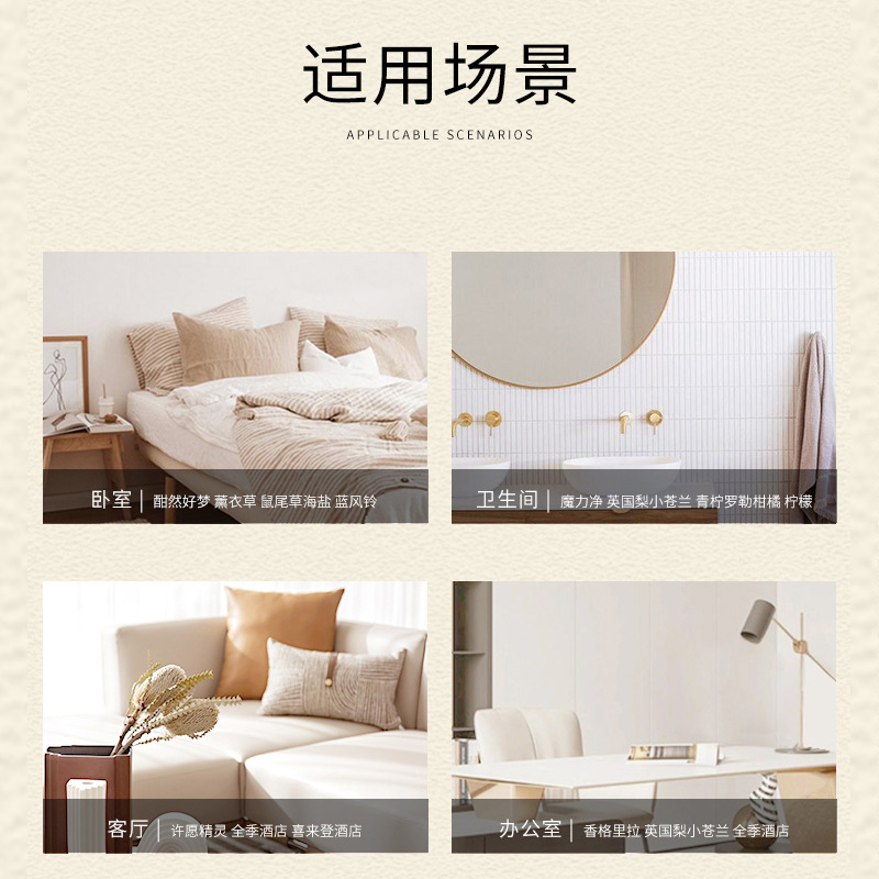 香型: 威斯汀白茶、香格里拉、法国薰衣草、柠檬泰式香茅、桂花、英国梨小苍兰、丽思卡尔顿酒店、希尔顿酒店、春日洋甘菊、喜来登酒店、邂逅、青柠罗勒柑橘、柠檬、古龙、茉莉、蓝风铃、青竹和茶香、大地、全季酒店、阿根廷甜橙、沁甜荔枝、洲际酒店、恬静晚香玉、乌木佛手柑、葡萄柚、迪拜帆船酒店、薄荷酒店、威尼斯人酒店、po