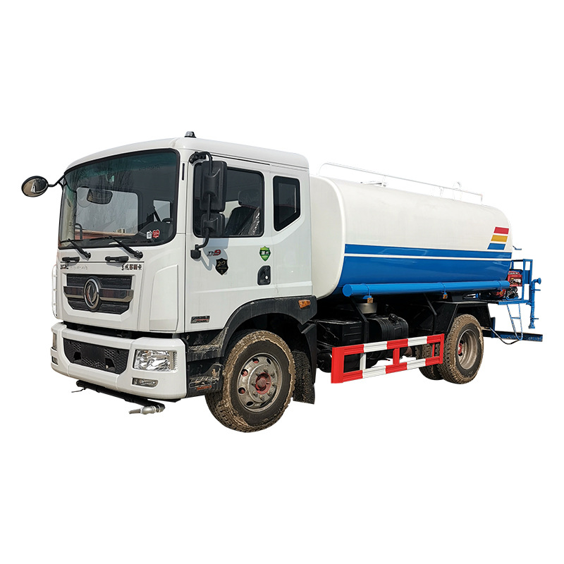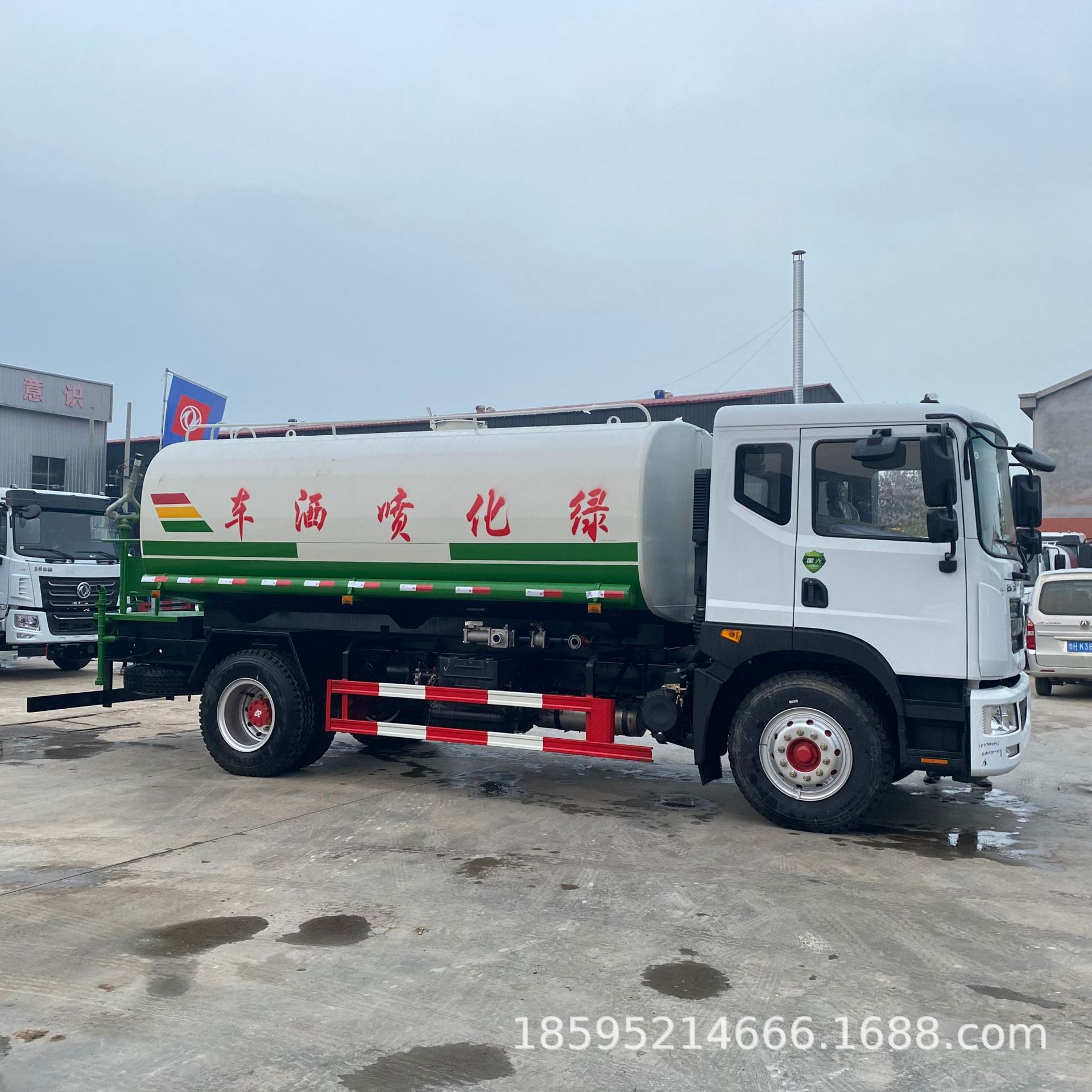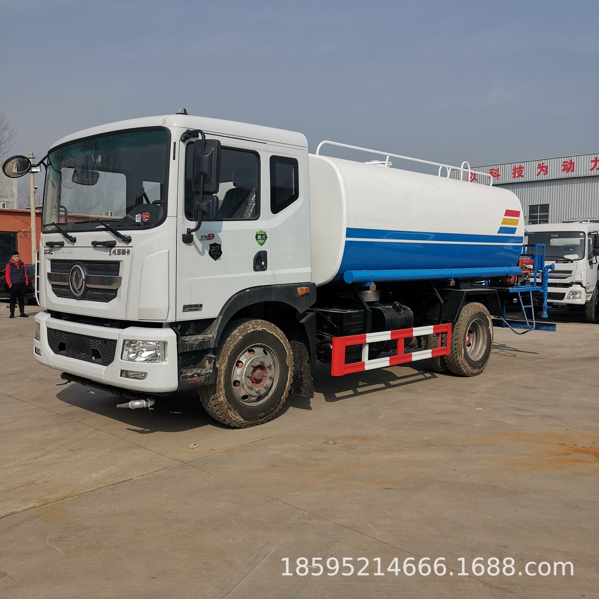 rn上装配置:罐体容积为12-15立方洒水车,罐体钢板为4.75mm碳钢Q235材质,罐内隔板具有防波作用,以减轻汽车行驶时罐体液体冲击,罐体及整车外形尺寸按照公告。带大功率专用洒水泵,泵可自吸自排,整车前冲、后洒、侧喷、带65消防接口,后平台带绿化洒水炮,洒水炮可旋转,可连续调成直冲状、大雨、小雨、毛毛雨;前封头带水位计,后平台主管路带1寸浇花接口,后爬梯。平台后部带小安全告知牌:“随时停车,注意安全”,带两根水管及阴阳端。罐体颜色:上白/下蓝,银灰/银蓝,罐体两侧喷“洒水车、绿化喷洒车”字样,贴反光标示。洒水车可加装前冲后洒气动阀驾驶室控制、可加装雾炮机组发电机组喷雾降尘装置、车头可加装推雪雪铲、雪滚装置街道、公路除雪等。