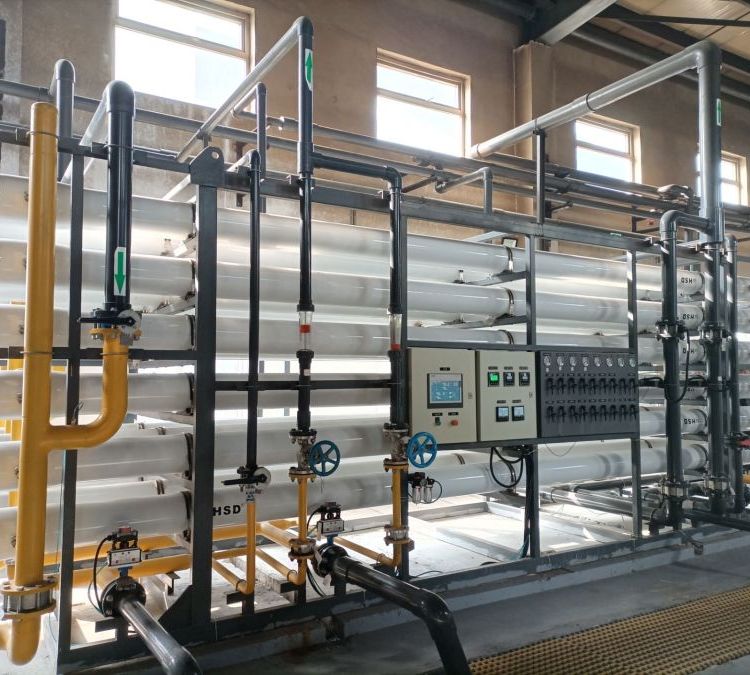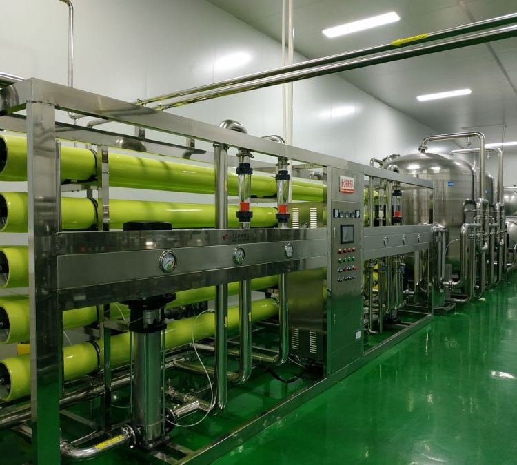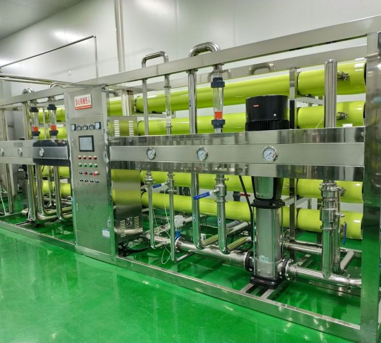 反渗透设备是将原水经过精细过滤器、颗粒活性碳过滤器、压缩活性碳过滤器等,再通过泵加压,利用孔径为1/10000μm(相当于大肠杆菌大小的1/6000,病毒的1/300)的反渗透膜(RO膜),使较高浓度的水变为低浓度水,同时将工业污染物、重金属、细菌、病毒等大量混入水中的杂质全部隔离,从而达到饮用规定的理化指标及卫生标准,产出至清至纯的水,是人体及时补充水分的理想选择。