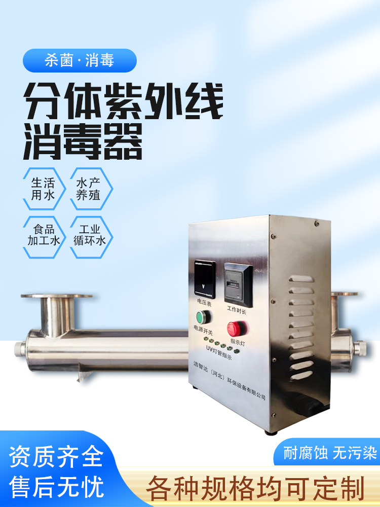 管式紫外线消毒器主要是利用波长在225纳米—275纳米的紫外线对微生物进行杀菌作用从而净化水质的设备,该设备一般选用不锈钢材质制造,当水流经过管式紫外线消毒器时,紫外线灯照射,从而将水中的细菌、病毒等微生物进行处理,处理效果可以达到99.99%。 紫外线消毒器二、管式紫外线消毒器特点1、紫外线消毒器