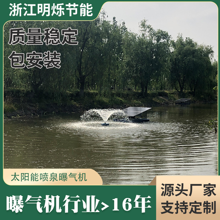 rn明烁太阳能喷泉式曝气机,是利用太阳能供电,驱动直流电机,通过叶轮旋转提升作用形成纵向与横向水流,将表层富氧水体与底层缺氧水体循环交替,达到为水体增氧的目的。主要用于河道、湖泊、水库、人工湖等的太阳能景观增氧系统。太阳能喷泉式增氧系统,解决了普通河道增氧曝气机的供电瓶颈。