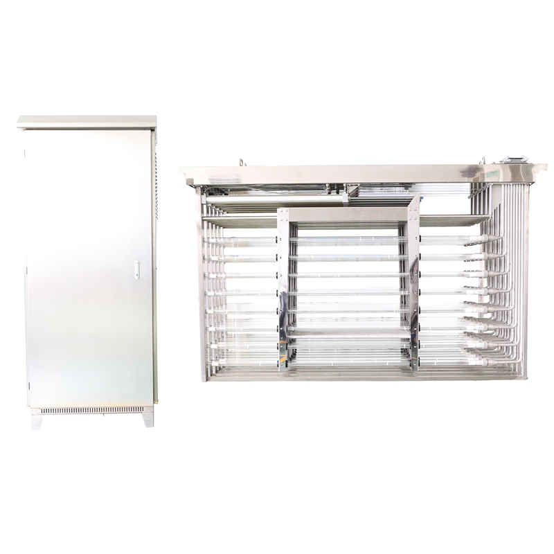 紫外模块采用为本产品量身定制生产的管材,主配部件均采用激光下料、开孔、切割,产品具有统一性、一致性、互换性、美观性、精度高、误差小。产品主梁、清洗系统、线路保护系统均采用独立模块化生产、格式化、组合式结构,安装方便快捷高效、省时、省力、省人工