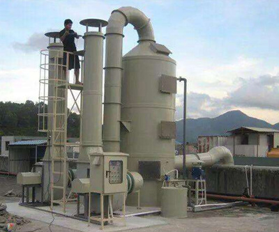 洗涤塔一般采用气液逆流操作,洗涤塔系统之风机组将收集到的废气吸入洗涤塔内,流经填充层段(气/液接触反应之介质),让废气与填充物表面流动的药液(洗涤液)充分接触,以吸附废气中所含的酸性或碱性污物。洗涤后,废液收集至集水槽中,再排放至废水系统处理。