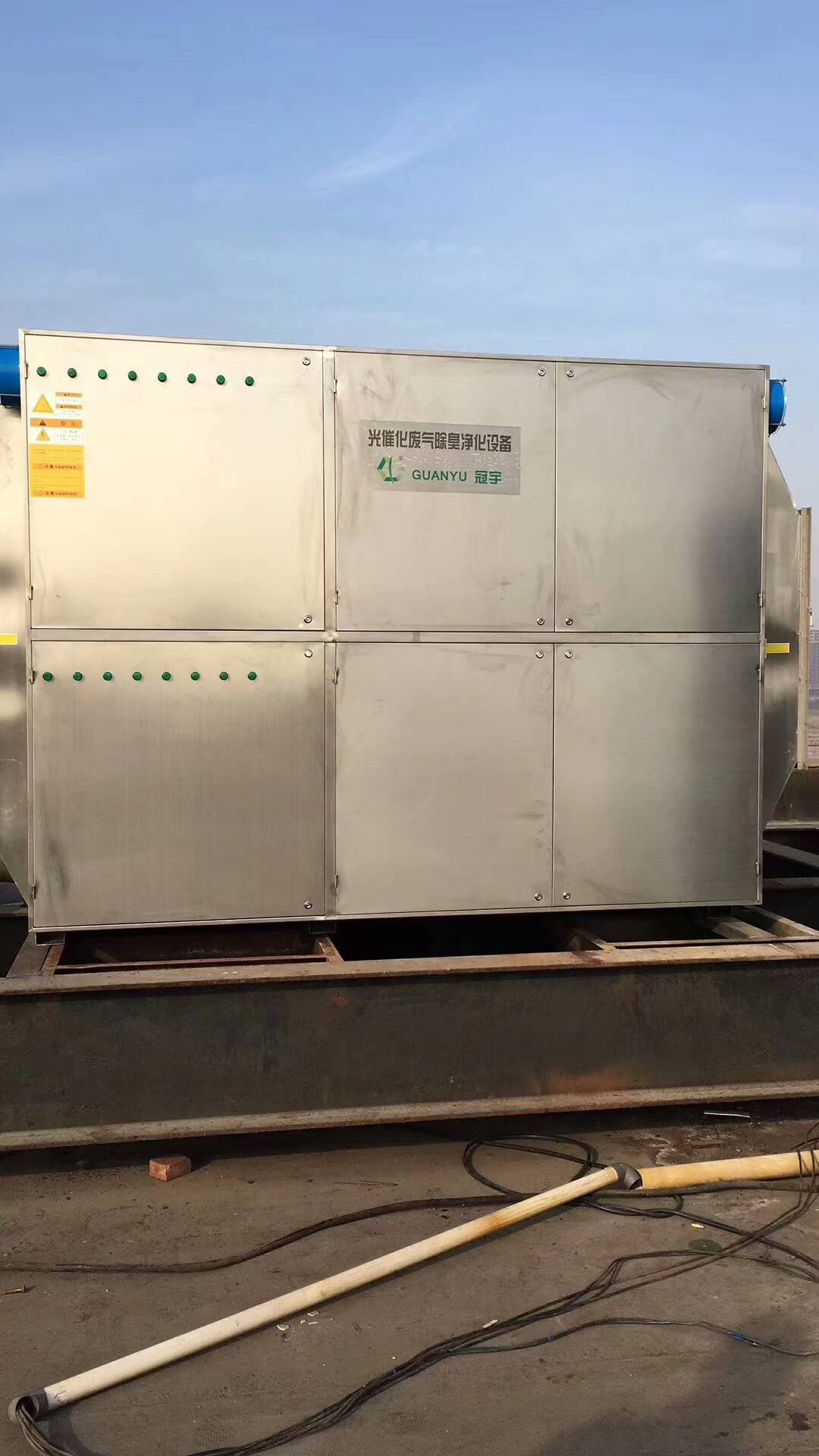 2) 第二步:经预处理后的废气,被抽引至光催化装置催化,在高能紫外灯光束的灯照射下,形成TiO2光催化氧化是活性羟基(•OH)和其他活性氧化类物质(•O2-,•OOH ,H2O2)共同作用的结果。在TiO2表面生成的•OH基团反应活性很高,具有高于有机物中各类化学键能的反应能,加上•O2-,•OOH ,H2O2活性氧化类物质的协同作用,能迅速有效地分解有机物。(主要作用:去废气中的容易被分解和氧化的废气成份(非甲烷总烃、苯类等VOC气体,并只有较好的消毒和除臭效果,使其达标排放);