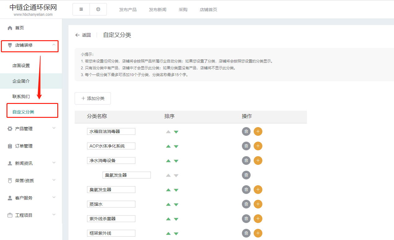第一步:点击左侧“店铺装修”里面的“自定义分类”