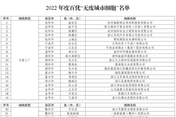 近日,浙江省美丽浙江建设领导小组生态环境保护工作专班公布了2022年度百优“无废城市细胞”名单,包括无废工厂、工业园区、乡村、学校、医院、工地、景区、饭店、体育场馆、机关、岛屿、汽车4S店等12大类123个“无废城市细胞”入选。 “无废城市” 是以创新、协调、...