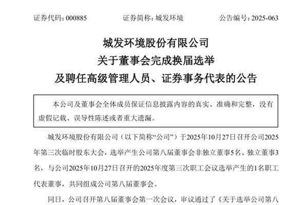 城发环境股份有限公司(简称:城发环境)于2025年10月27日召开公司2025年第三次临时股东大会,选举产生公司第八届董事会非独立董事5名、独立董事3名,与公司2025年10月27日召开的2025年度第三次职工会议选举产生的1名职工代表董事,共同组成公司第八届董事会。同日,城发环境召开第八届董事会第一次会议,选举第八届董事会董事长、董...