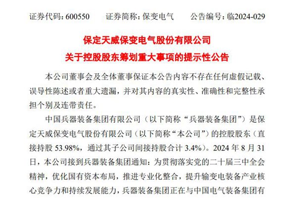 近日,中国兵器装备集团有限公司(下称“中国兵器装备集团”)旗下控股上市公司保定天威保变电气股份有限公司(简称:保变电气)发布公告称,为贯彻落实二十届三中全会精神,优化国有资本结构与增强竞争力,兵器装备集团正与与中国电气装备集团有限公司(下称“中国电气装备集团”)开展输变电装备业务整合事宜...