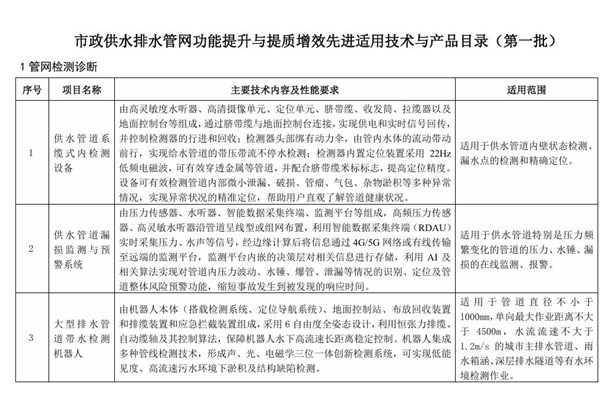 关于发布《市政供水排水管网功能提升与提质增效先进适用技术与产品目录(第一批)》的通知 有关单位: 为贯彻落实全国住房城乡建设工作会议精神,深入践行人民城市理念,满足城市老旧地下管网改造和城市生命线安全工程建设对相关技术与产品迫切需求,我中心组织开展了市政供水排水管网功能提升与提质增效先进适用技术与产品征集工作。经专家评审和网上公示,形...
